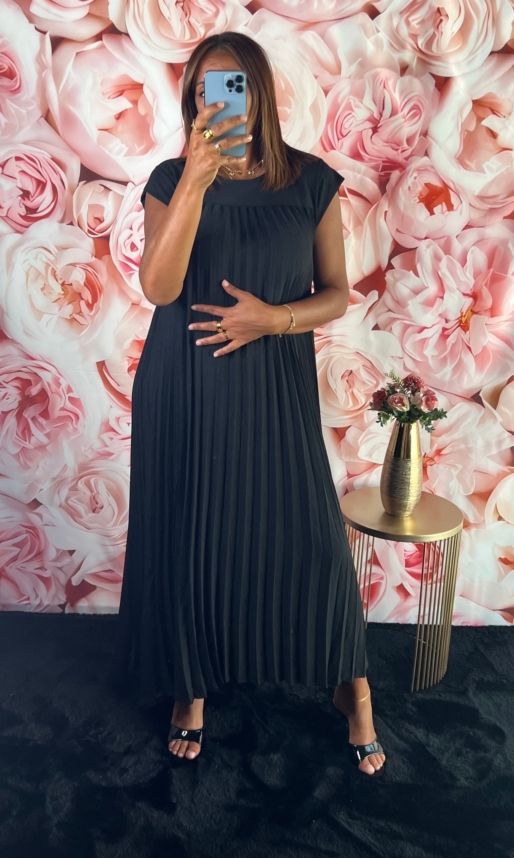 Cette robe fluide noire plissée vous offrira une silhouette raffinée et élégante, tout en apportant une touche de modernité à votre look. Sa coupe fluide et ses plis soigneusement travaillés mettront en valeur votre féminité, tandis que sa simplicité en fera un choix polyvalent et intemporel.